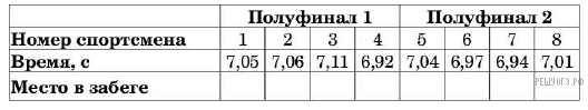 Версия для печати и копирования в MS WordВ таблице приведены результаты двух полуфинальных забегов на дистанцию 60 м. В финальном забеге 6 участников. Из каждого полуфинала в финал выходят два спортсмена, показавших первый и второй результаты. К ним добавляют еще двух спортсменов, показавших лучшее время среди всех остальных участников полуфиналов.