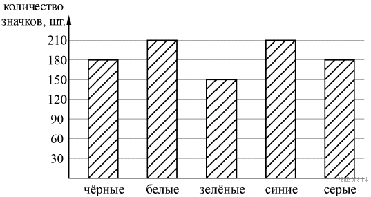 Рок-магазин продает значки с символикой рок-групп. В продаже имеются значки пяти цветов: черные, синие, зеленые, серые и белые. Данные о проданных значках представлены на столбчатой диаграмме.