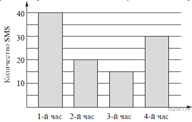 Версия для печати и копирования в MS WordНа диаграмме показано количество SMS, присланных слушателями за каждый час четырехчасового эфира программы по заявкам на радио. Определите, на сколько больше сообщений было прислано за первые два часа программы по сравнению с последними двумя часами этой программы.