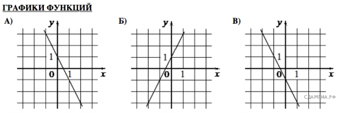 Если значение функции возрастает с увеличением x, то коэффициент k положителен, если убывает — отрицателен. Значение b соответствует значению функции в точке x = 0. Следовательно, если график пересекает ось ординат выше оси абсцисс, то значение b положительно, если ниже оси абсцисс — отрицательно. Таким образом, А - 2, Б - 3, В - 1