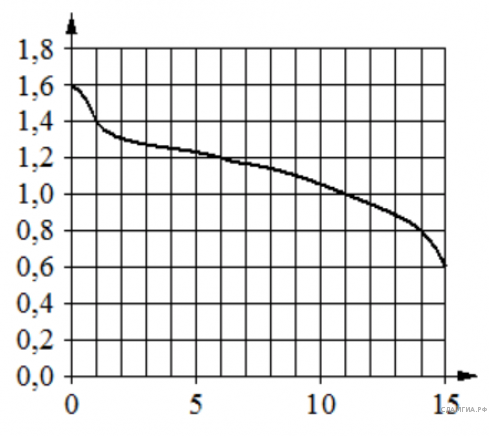При работе фонарика батарейка постепенно разряжается и напряжение в электрической цепи фонарика падает. На графике показана зависимость напряжения в цепи от времени работы фонарика. На горизонтальной оси отмечено время работы фонарика в часах, на вертикальной оси - напряжение в вольтах. Определите по графику, на сколько вольт упадет напряжение с 6-го по 14-й час работы фонарика.