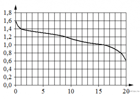 При работе фонарика батарейка постепенно разряжается и напряжение в электрической цепи фонарика падает. На графике показана зависимость напряжения в цепи от времени работы фонарика. На горизонтальной оси отмечено время работы фонарика в часах, на вертикальной оси - напряжение в вольтах. Определите по графику, на сколько вольт упадет напряжение за первые 20 часов работы фонарика.