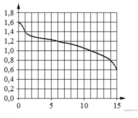 При работе фонарика батарейка постепенно разряжается и напряжение в электрической цепи фонарика падает. На графике показана зависимость напряжения в цепи от времени работы фонарика. На горизонтальной оси отмечено время работы фонарика в часах, на вертикальной оси - напряжение в вольтах. Определите по графику, на сколько вольт упадет напряжение с 1-го по 15-й час работы фонарика.