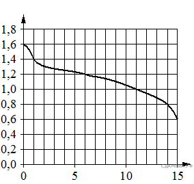 При работе фонарика батарейка постепенно разряжается и напряжение в электрической цепи фонарика падает. На графике показана зависимость напряжения в цепи от времени работы фонарика. На горизонтальной оси отмечено время работы фонарика в часах, на вертикальной оси — напряжение в вольтах. Определите по графику, на сколько вольт упадет напряжение с 1-го по 6-й час работы фонарика.