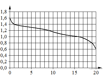 При работе фонарика батарейка постепенно разряжается и напряжение в электрической цепи фонарика падает. На графике показана зависимость напряжения в цепи от времени работы фонарика. На горизонтальной оси отмечено время работы фонарика в часах, на вертикальной оси — напряжение в вольтах. Определите по графику, на сколько вольт упадет напряжение с 1-го по 9-й час работы фонарика.
