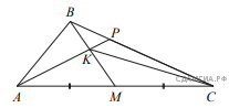 Версия для печати и копирования в MS WordВ треугольнике ABC на его медиане BM отмечена точка K так, что Прямая AK пересекает сторону BC в точке P. Найдите отношение площади треугольника AKM к площади четырехугольника