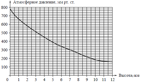 На графике изображена зависимость атмосферного давления (в миллиметрах ртутного столба) от высоты над уровнем моря (в километрах). Найдите, чему равно атмосферное давление на высоте 9 км.