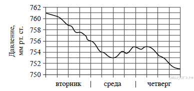 На рисунке изображен график изменения атмосферного давления в городе Энске за три дня. По горизонтали указаны дни недели, по вертикали — значения атмосферного давления в миллиметрах ртутного столба. Укажите наименьшее значение атмосферного давления во вторник.