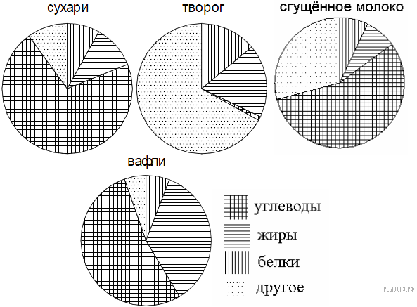 На диаграмме показано содержание питательных веществ в четырех видах продуктов. Определите по диаграмме, в каких продуктах содержание углеводов превышает 50%.