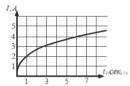 На рисунке изображен график изменения силы тока при подключении цепи, содержащей реостат, к источнику тока. По вертикальной оси откладывается сила тока I (в A), по горизонтальной — время t (в сек). По рисунку определите силу тока через 6 секунд с момента подключения данной цепи.